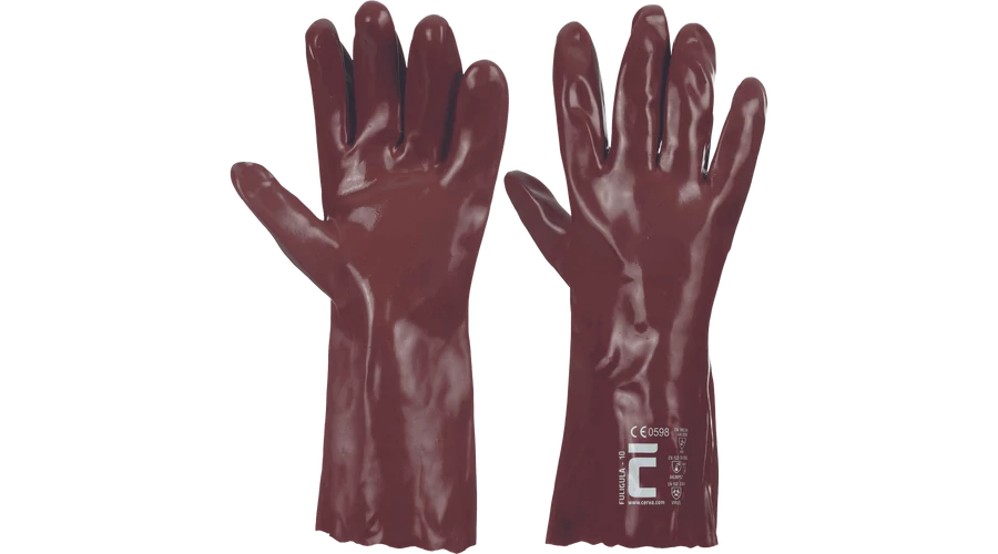 PVC mártott védőkesztyű kötött pamut kesztyűalapon. Védelmet nyújt mechanikai és vegyi kockázatok ellen. Hossz: 35 cm.